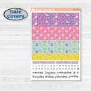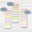 3 washi headers 5.15” x .66”. These are for the Week at a glance page, the page facing the week at a glance and the page after Sunday. When purchased in combination with the Date Covers you will have enough stickers for the top of every page dedicated to the week. 7 checklist strips, 3 habit trackers, 7 day of the week labels, week of, 3 labels and various icons.