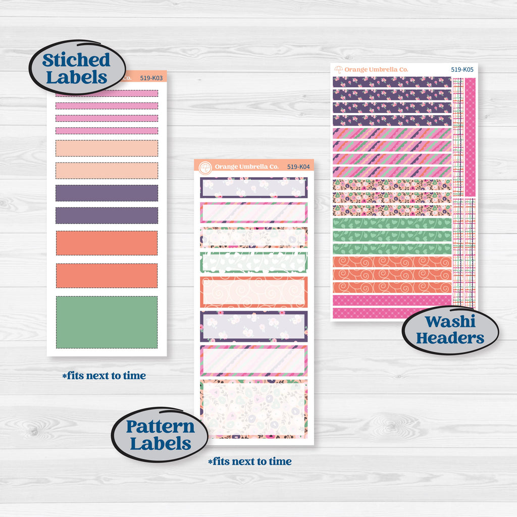 3 Washi Top Headers 6.5β x .75β, 7 date labels, 7 checklist strips, 3 habit trackers, various scripts, icons and labels.