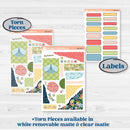 Two large torn washi 6.4” x .77”, 7 small labels 1.4” x .38”, 3 large labels 1.4” x .57”, days of the week 1.28” x .36”, torn corner 2.9” x .93”, various doo dads