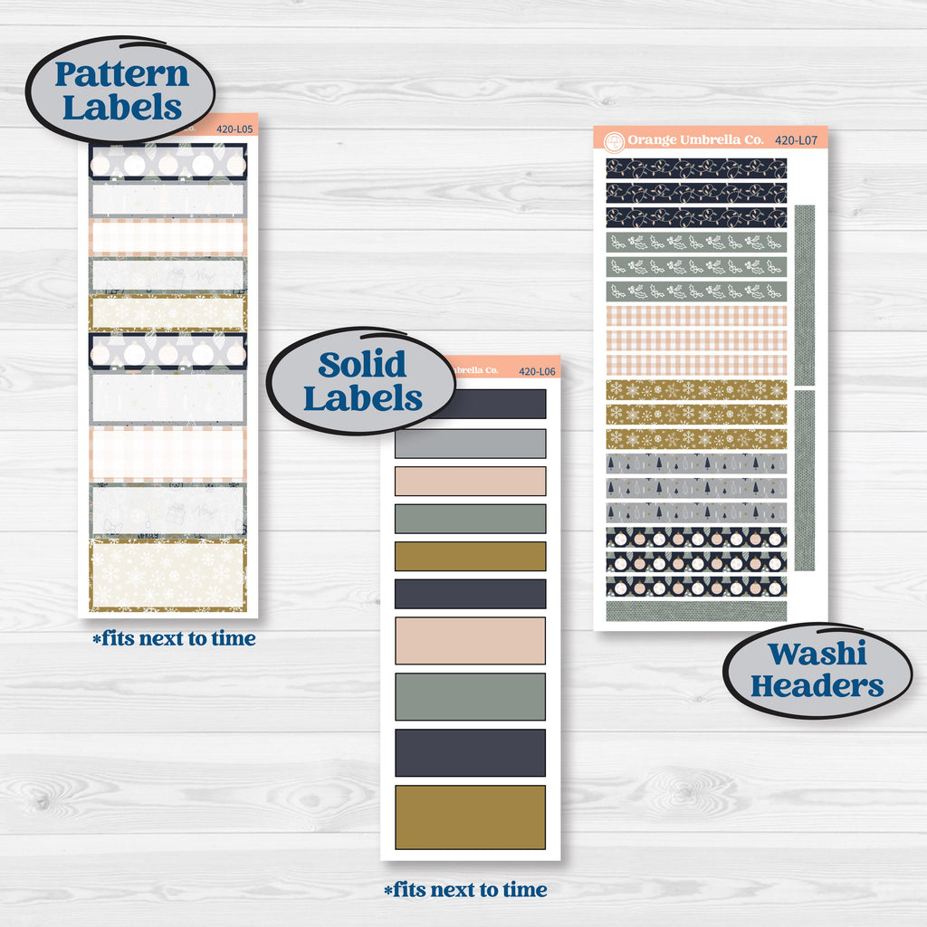 3 washi headers 5.15β x .66β. These are for the Week at a glance page, the page facing the week at a glance and the page after Sunday. When purchased in combination with the Date Covers you will have enough stickers for the top of every page dedicated to the week. 7 checklist strips, 3 habit trackers, 7 day of the week labels, week of, 3 labels and various icons.