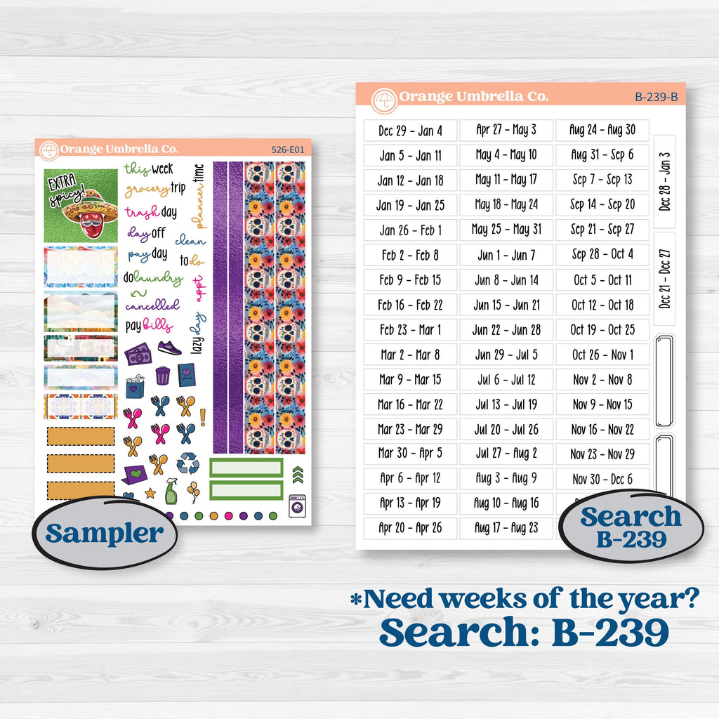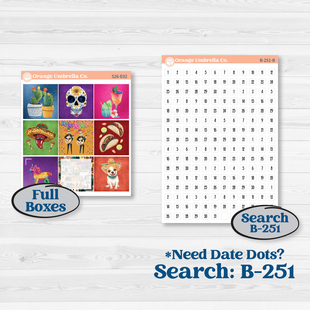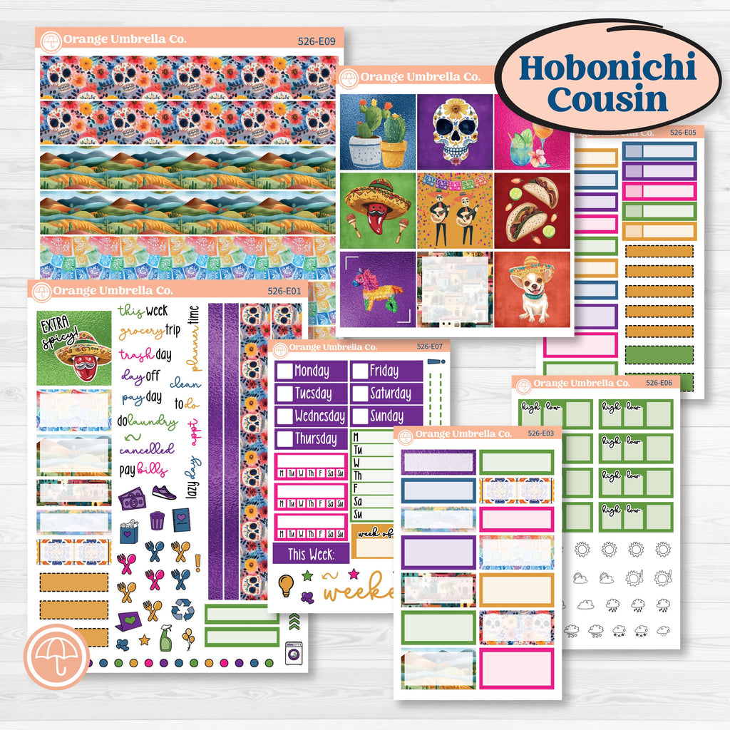 🌵 Cactus illustrations and desert-inspired landscapes balance the brighter fiesta elements for a cohesive layout.