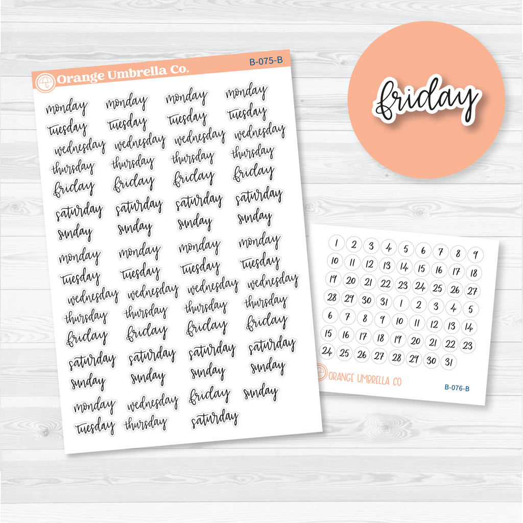 Looking for a clean, modern way to label your weekly planner pages? These black script Days of the Week stickers include multiple sets of “monday” through “sunday” in a classic cursive style—perfect for functional layouts, minimal aesthetics, or undated spreads. You’ll also get a bonus mini sheet of numbered date dots (1–31) for customizing your weeks and months.