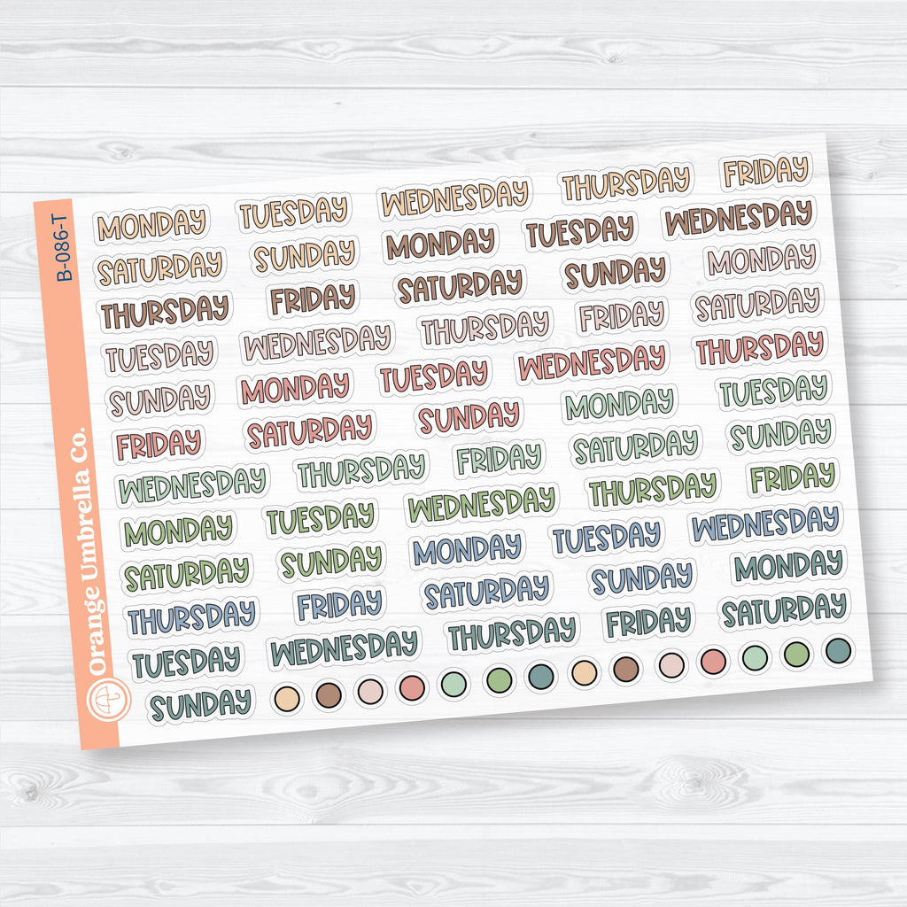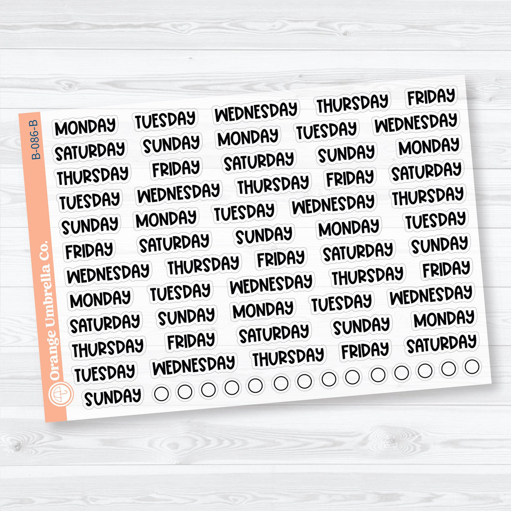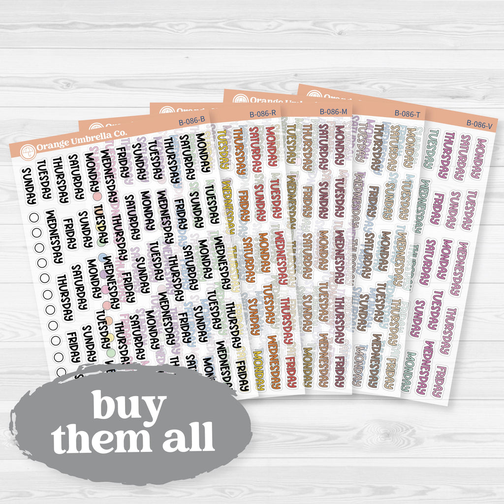 ✨ Bring bold, funky style to your planner layouts with these clear matte Days of the Week stickers! Each sheet includes eight full weeks of weekday headers that layer beautifully over patterned spreads or decorative pages. Perfect for planners, bullet journals, and scrapbooks that need a clean yet playful look.