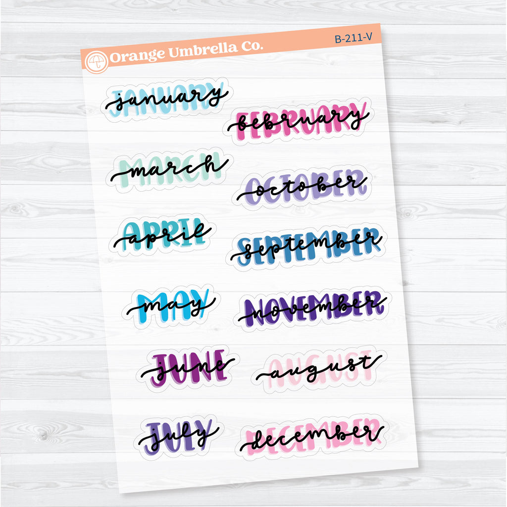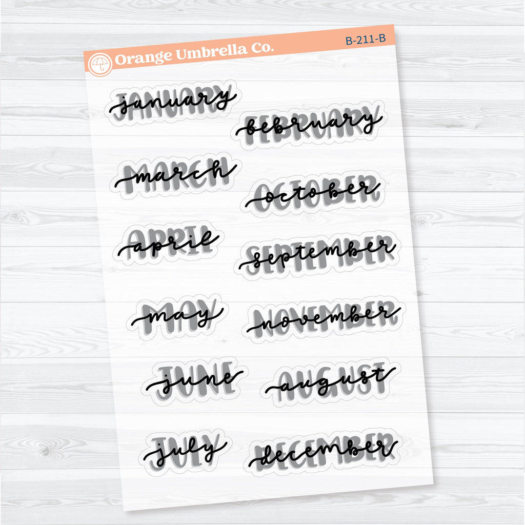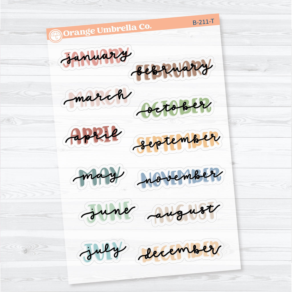 🗓️ Add bold, playful month headers to your planner with these large hand doodled month planner stickers, now available in a clear matte (transparent) finish. Each script-style month label features a hand-drawn underline and soft highlight effect that blends smoothly into planner pages while still standing out. Their larger size makes them perfect for dashboards, monthly overview pages, dividers, and planner section titles.