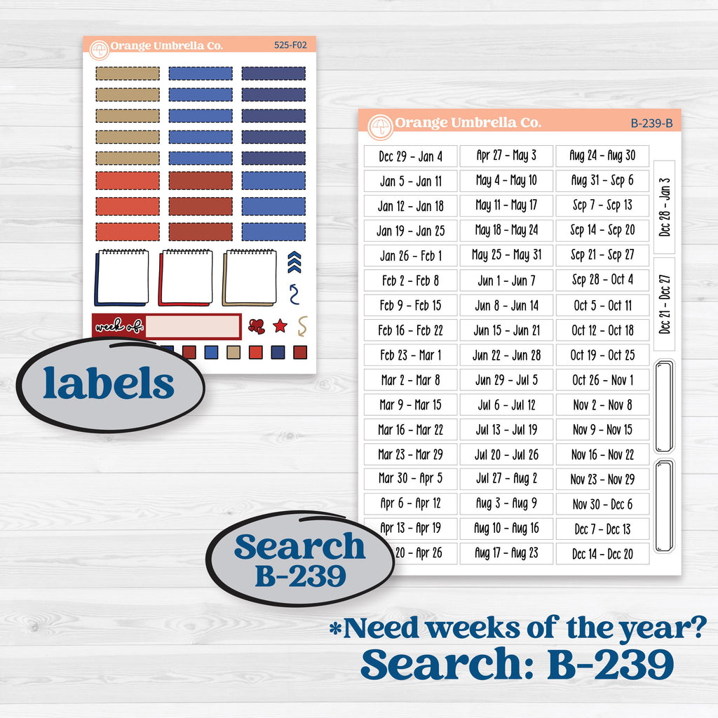 Top washi 3.2β x .35β, bottom washi 3.2β x .78β, date covers 5.8β x .3β, box strips 5.8β x .83β, 3 full boxes .83β x .83β, various labels .94β wide, scripts and icons in various sizes