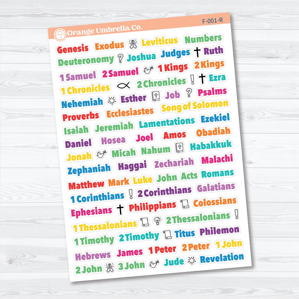 • 88 stickers per sheet (includes all 66 books of the Bible and icons)
