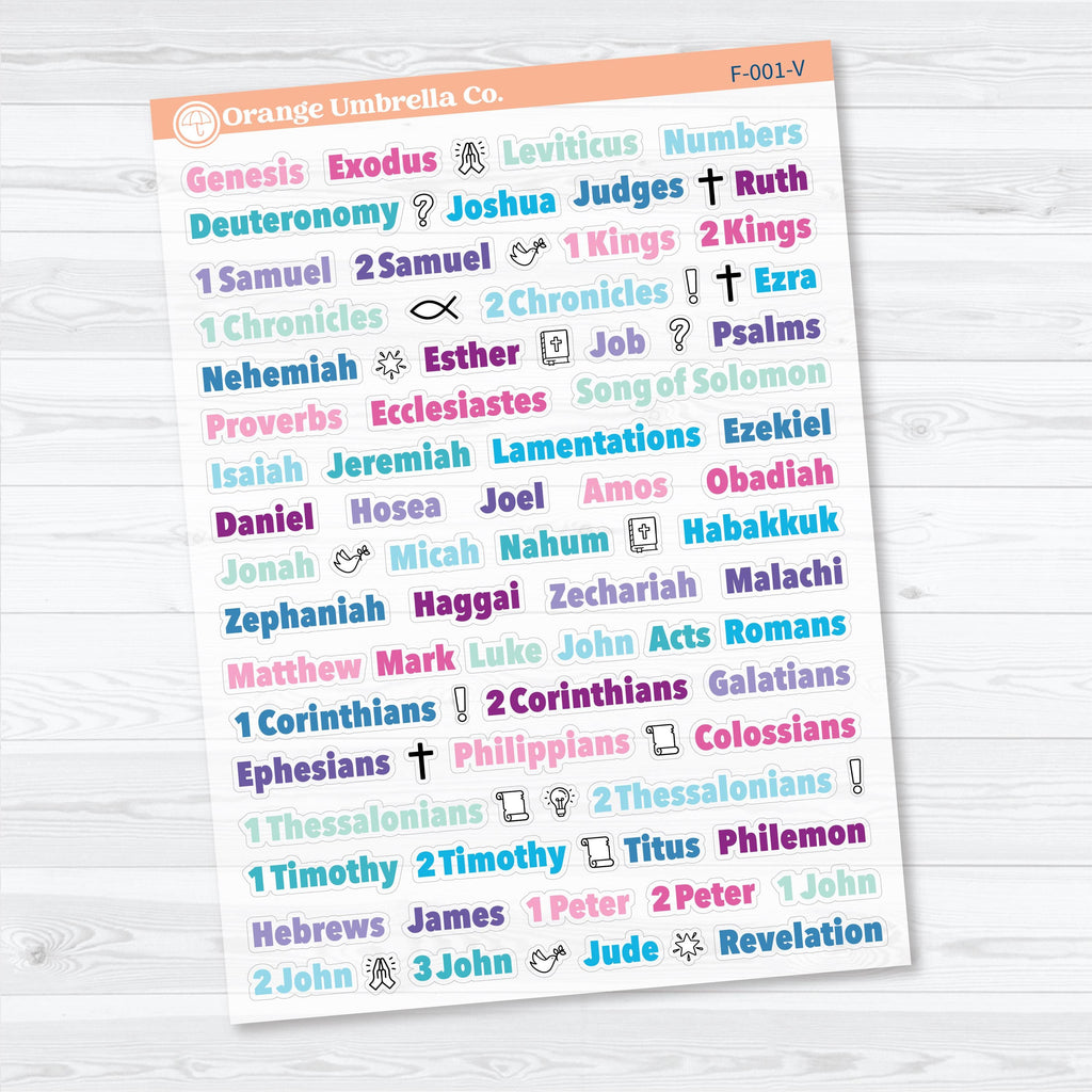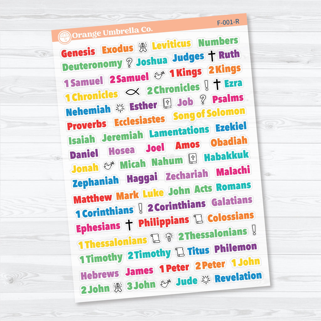 • 88 stickers per sheet (includes all 66 books of the Bible and icons)