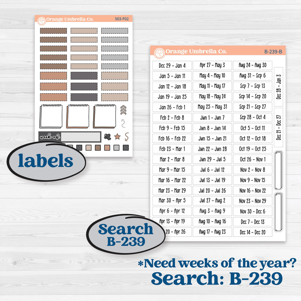 Top washi 3.2β x .35β, bottom washi 3.2β x .78β, date covers 5.8β x .3β, box strips 5.8β x .83β, 3 full boxes .83β x .83β, various labels .94β wide, scripts and icons in various sizes