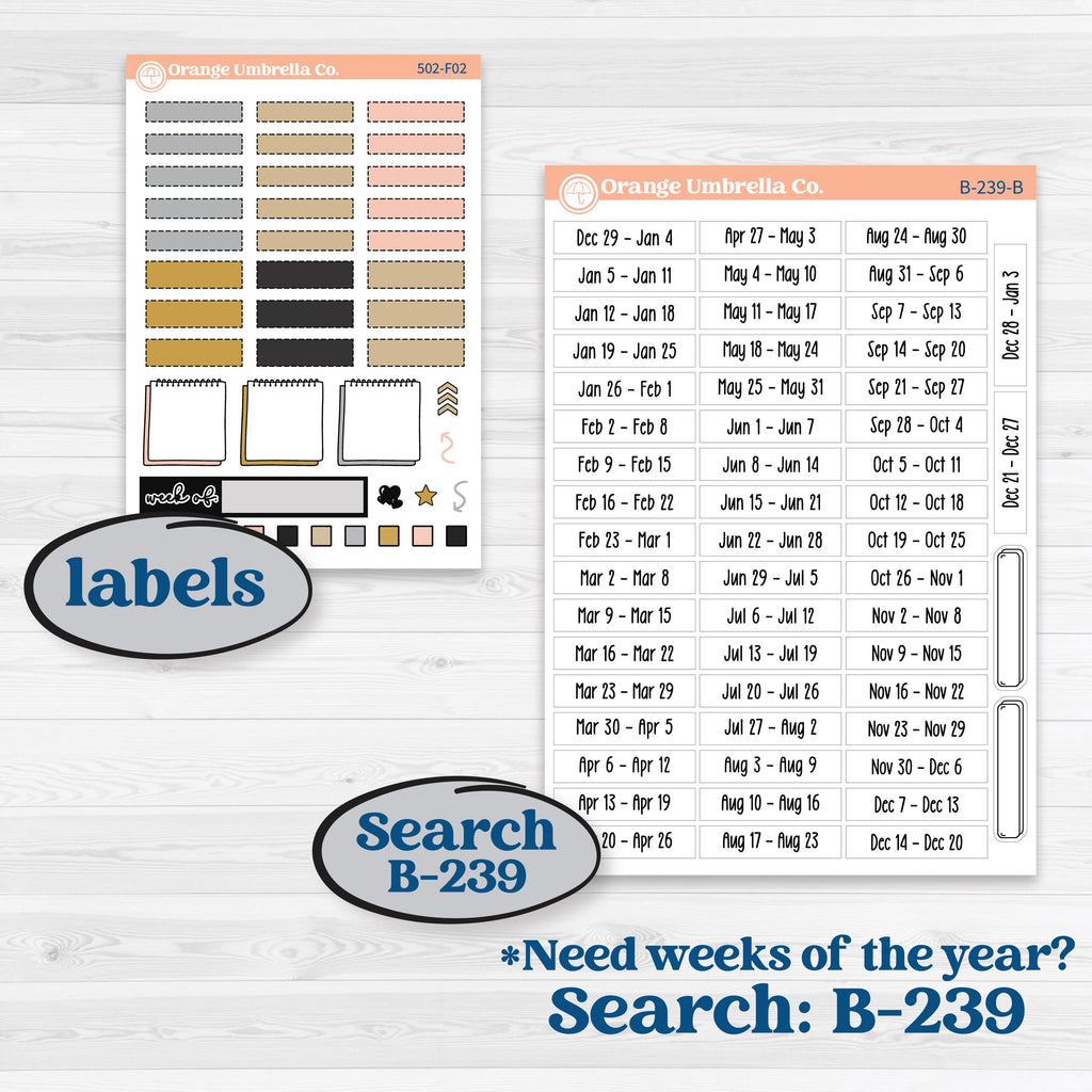 Top washi 3.2” x .35”, bottom washi 3.2” x .78”, date covers 5.8” x .3”, box strips 5.8” x .83”, 3 full boxes .83” x .83”, various labels .94” wide, scripts and icons in various sizes