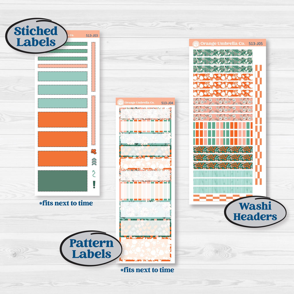3 washi headers 5.15β x .66β. These are for the Week at a glance page, the page facing the week at a glance and the page after Sunday. When purchased in combination with the Date Covers you will have enough stickers for the top of every page dedicated to the week. 7 checklist strips, 3 habit trackers, 7 day of the week labels, week of, 3 labels and various icons.