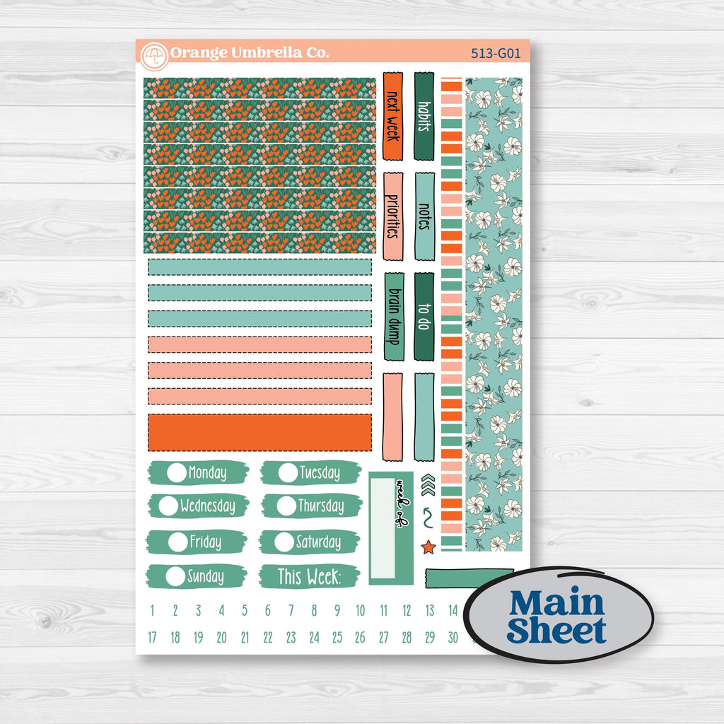 Top washi 6.5β x .75β, thin washi 6.5β x .24β, date covers 1.5β x .44β, various labels 3.1β wide, category labels 1.3β x .38β, 31 date dots, week of label and various doo dads included.
