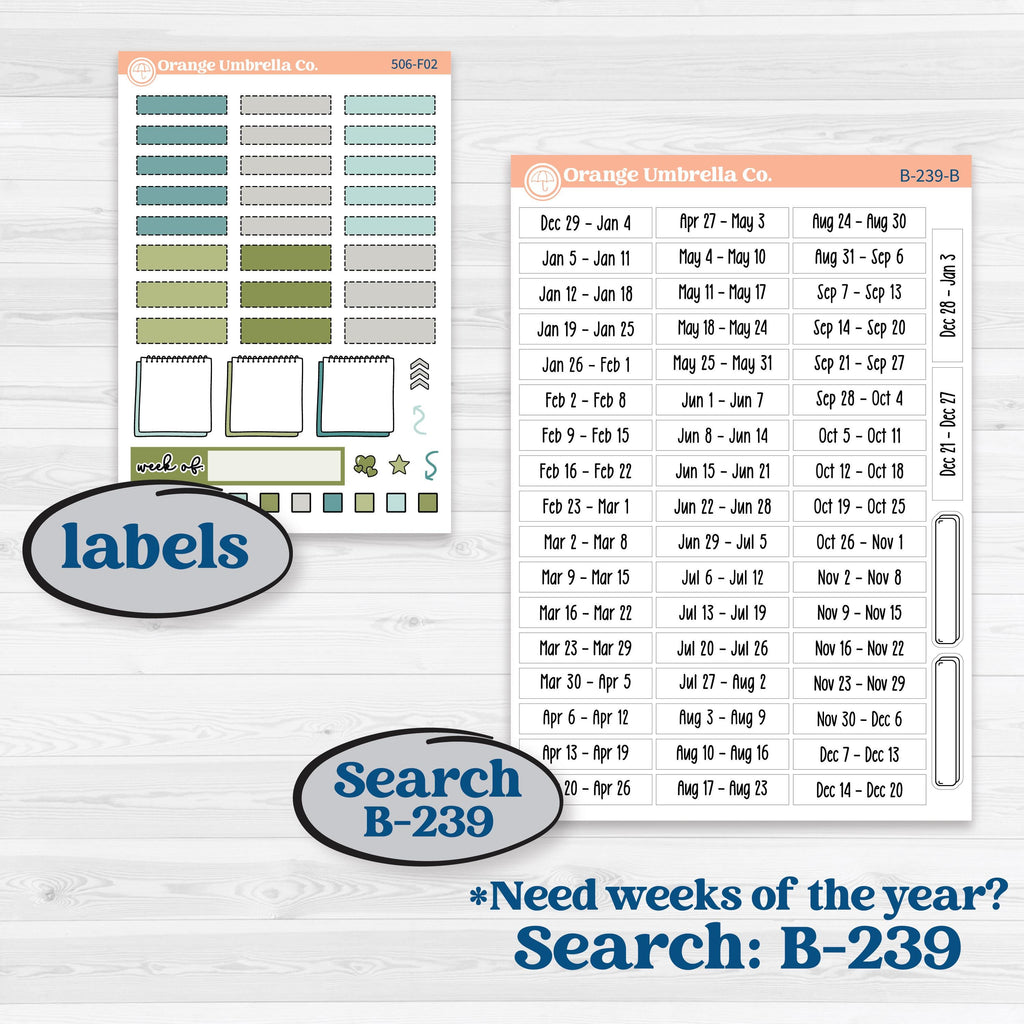 Top washi 3.2β x .35β, bottom washi 3.2β x .78β, date covers 5.8β x .3β, box strips 5.8β x .83β, 3 full boxes .83β x .83β, various labels .94β wide, scripts and icons in various sizes