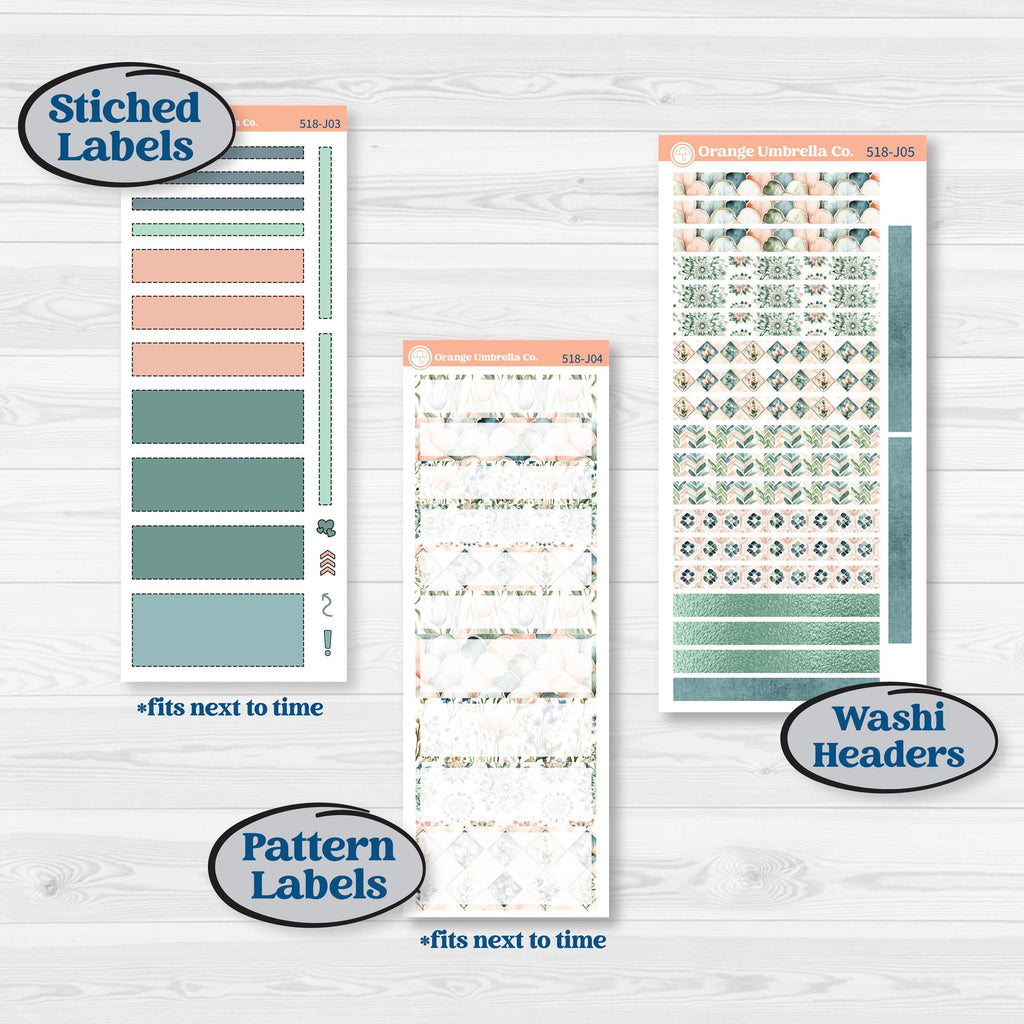 3 washi headers 5.15β x .66β. These are for the Week at a glance page, the page facing the week at a glance and the page after Sunday. When purchased in combination with the Date Covers you will have enough stickers for the top of every page dedicated to the week. 7 checklist strips, 3 habit trackers, 7 day of the week labels, week of, 3 labels and various icons.