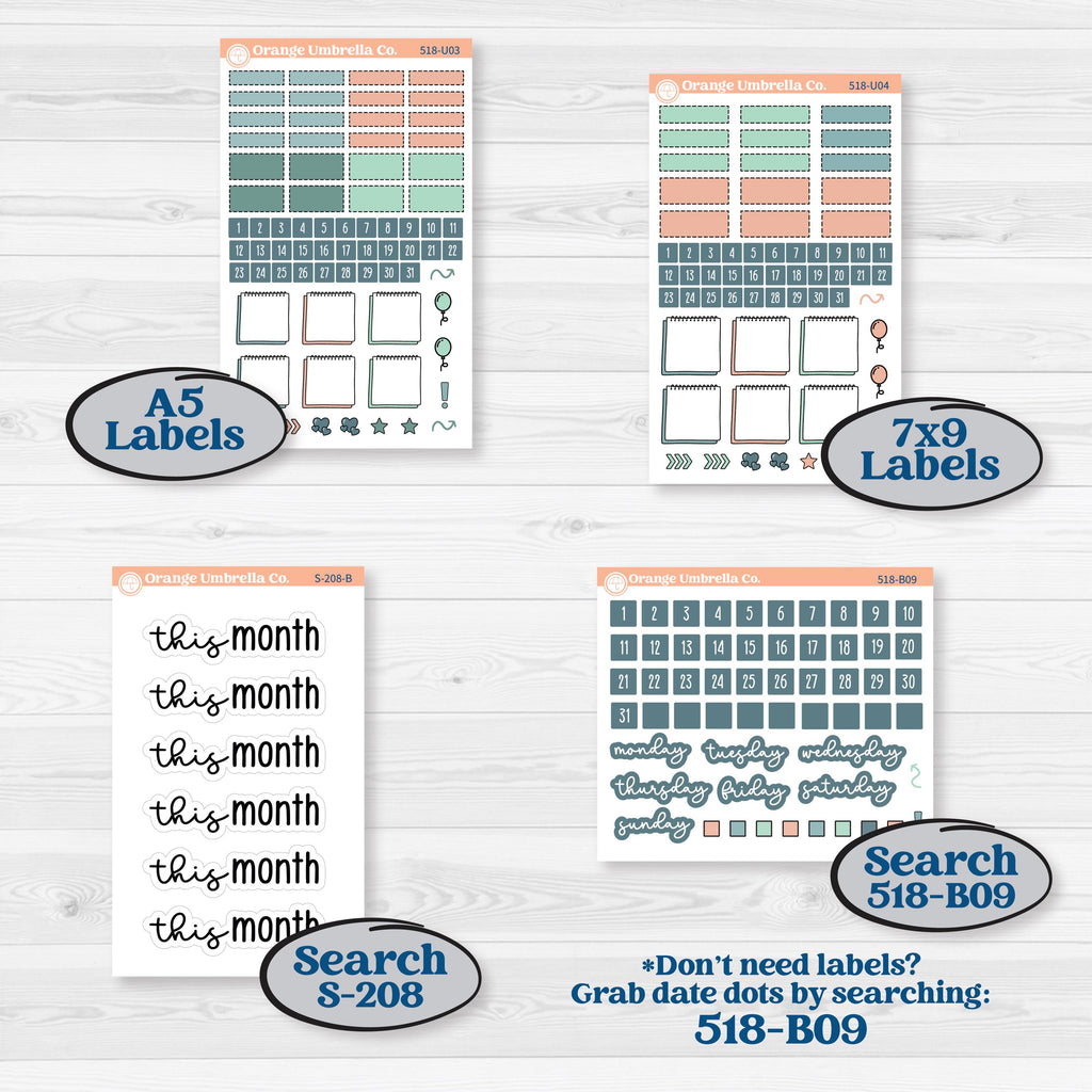 one large 5.27β x 7.62β sticker that contains both monthly and bottom box; includes individual days of the week and 3 labels