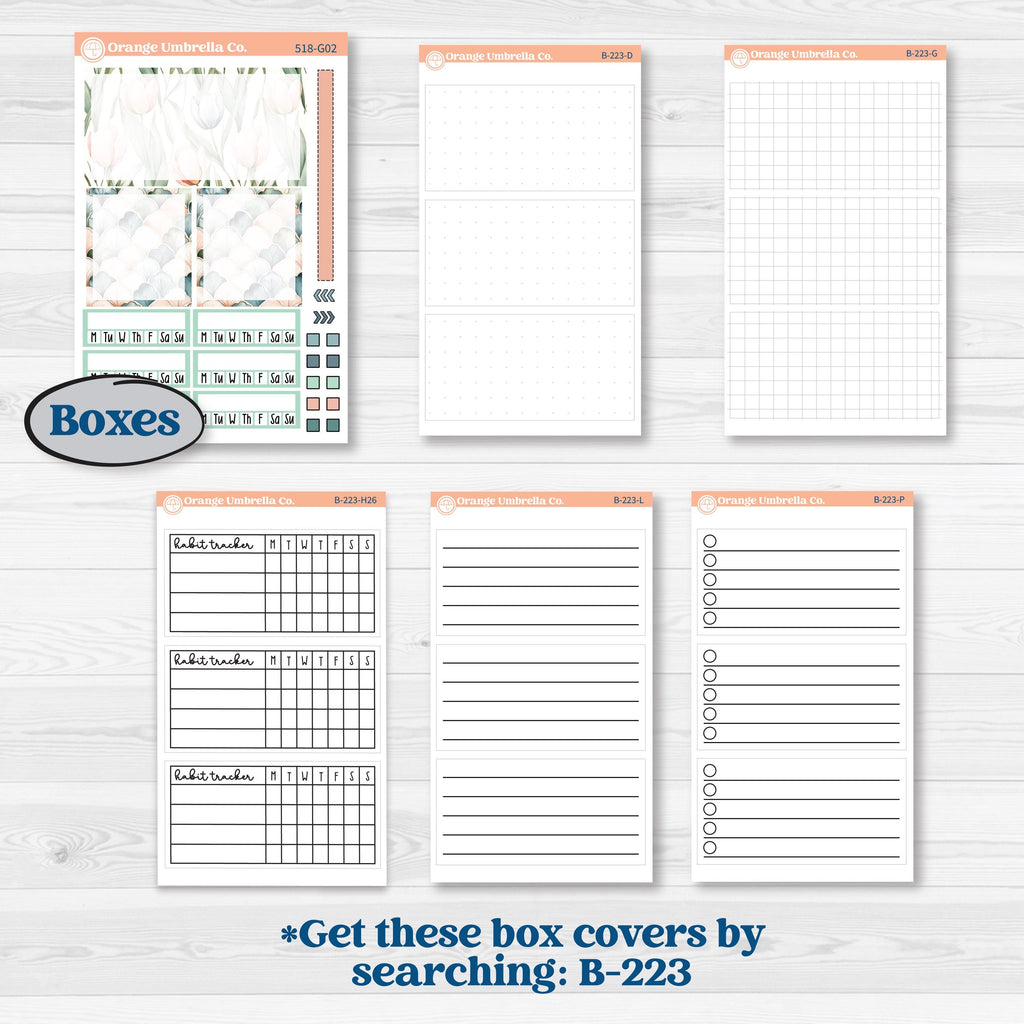 Right page, left box cover 1.69β x 3.2β, 2 half habit tracker cover boxes 1.69β x 1.5β (also make great boxes for anywhere on the layout!), 6 habit trackers 1.53β x .51β, various doo dads and label included.