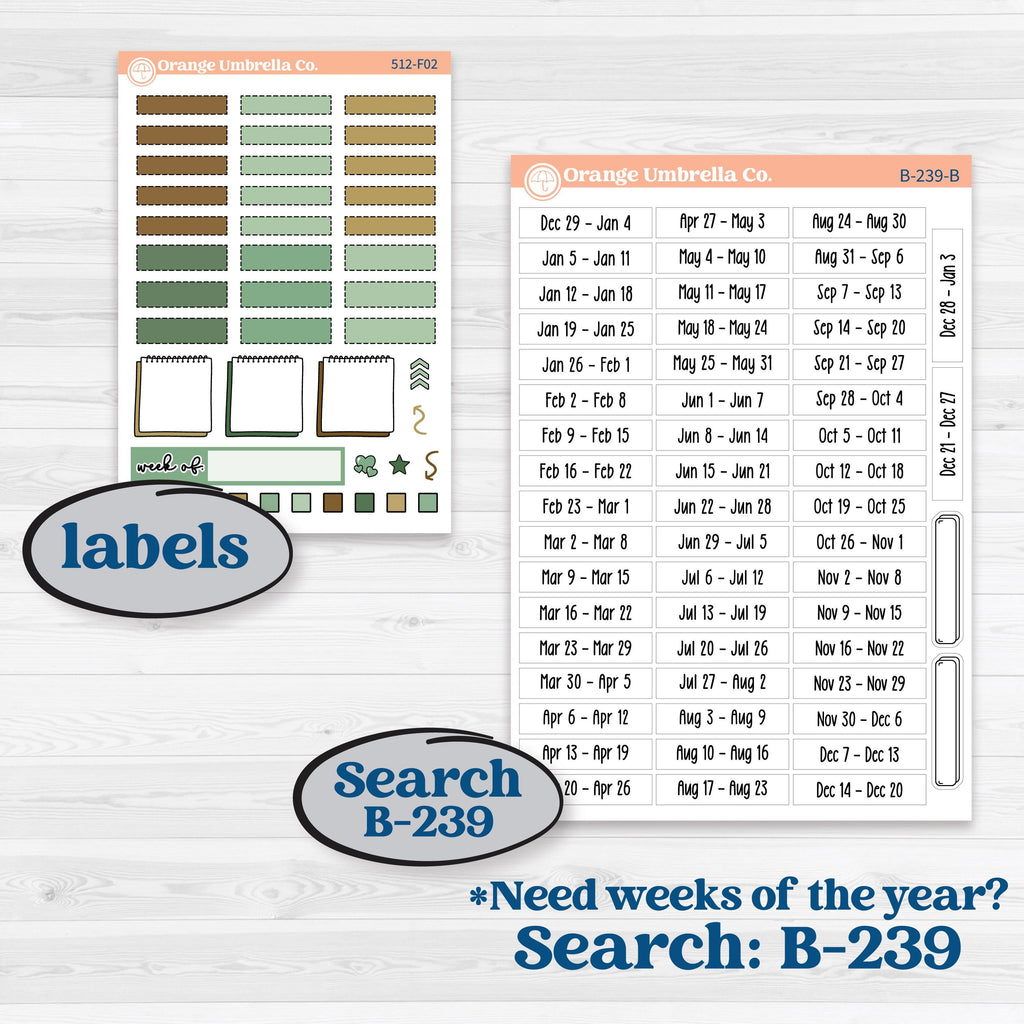 Top washi 3.2” x .35”, bottom washi 3.2” x .78”, date covers 5.8” x .3”, box strips 5.8” x .83”, 3 full boxes .83” x .83”, various labels .94” wide, scripts and icons in various sizes