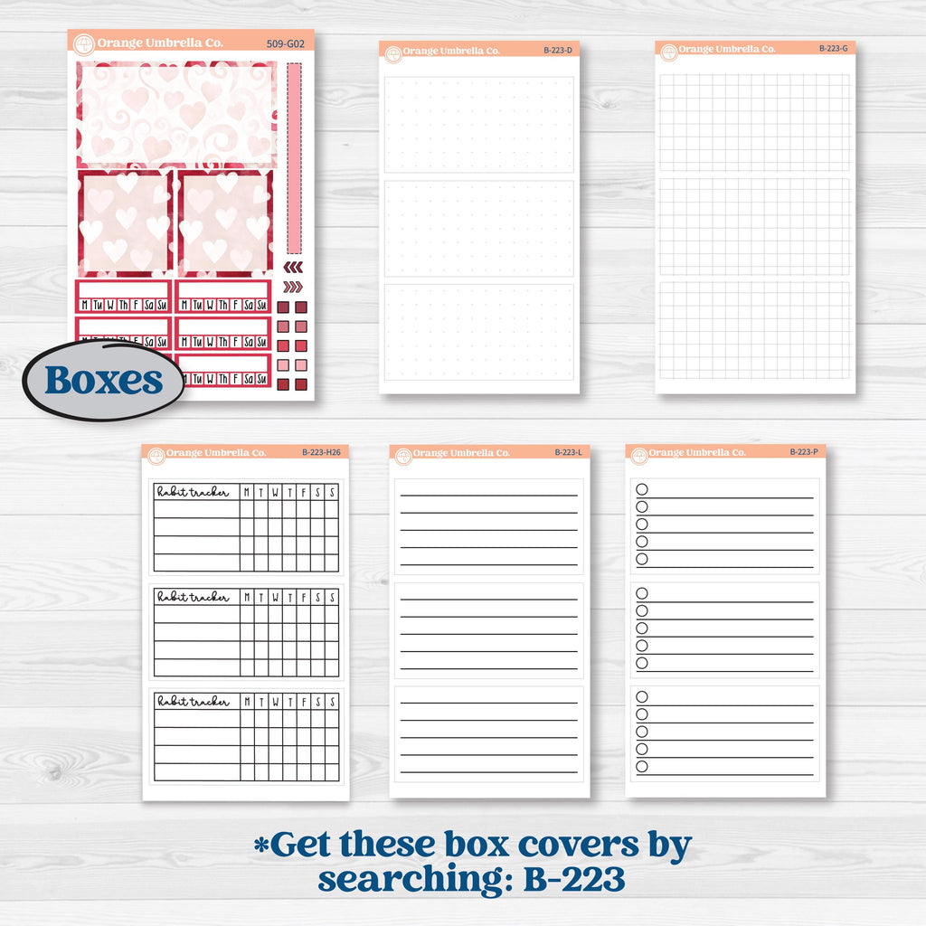 Right page, left box cover 1.69β x 3.2β, 2 half habit tracker cover boxes 1.69β x 1.5β (also make great boxes for anywhere on the layout!), 6 habit trackers 1.53β x .51β, various doo dads and label included.